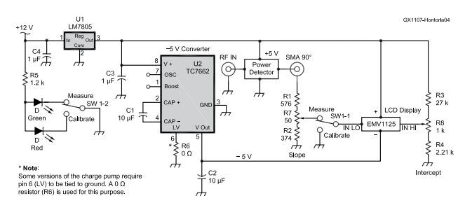 The schematic shown in Figure 4 is quite simple: one potentiometer sets the slope and the other sets the intercept of the response curves. Since - up to 6 GHz - the linear portions are essentially parallel, the slope pot is set once and left alone. As Figure 3 shows, the 8 GHz output voltage curve is quite noticeably different than the lower frequency curves, and would require a different calibration. The intercept is a function of the frequency and is set at the time of calibration or simply taken from the Mini-Circuits curves.