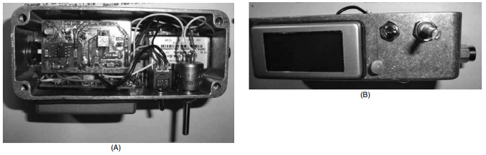 Figure 5 depicts my original unit. The left side of Part A has the 12 V jack. There was a 7805 voltage regulator bolted to the box floor underneath the circuit board and both the regulator and circuit board were secured by the screw visible at the top left corner of the circuit board. The IC visible on the circuit board is a charge pump to get the -5 V needed for the Lascar LCD voltmeter. I have built a newer version and have moved all the components to the printed circuit board. That has simplified the wiring. Figure 6 is a picture of the inside of the newer version.