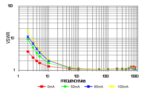 The equivalent inductance of the Super Wide-band RF choke ADCH-80+ is one microhenry at 100 mA. For comparison, a typical commercially available one microhenry inductor has a series resonant frequency as low as 90 MHz, which is much lower than this RF choke. Figure 4 plots the insertion loss and Figure 5 the VSWR at various currents up to 100 mA, for the RF choke placed in shunt across a 50-ohm transmission line. Note that the insertion loss and VSWR change very little with change in current in the specified frequency band.