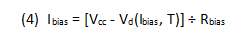 The “∆” ratios are the respective device-voltage vs. current and device-voltage vs. temperature coefficients. V0 is the Vd-axis intercept of the linear extension of the Vd vs. Ibias curve, at room temperature T0. Substituting for Vd from (5) into (4) and solving for Ibias: