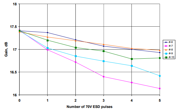 Five units were stressed repeatedly with 100V ESD pulses. Electrical tests for gain and device voltage were done after each ESD pulse. After the first pulse gain dropped by 0.44dB and device voltage increased by 0.83V (that is more than 10%, which would be 0.5V). More 100V ESD pulses caused more degradation in gain and device voltage. After the third pulse at 100V gain is less by 1.27dB, and device voltage is higher by 1.9V.